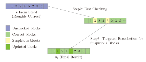 该论文基于的攻击模型是第一大类中的Plaintext-Checking Oracle-based Attack,也可称为Key Mismatch Attack.论文关注了在实际攻击中可能受到的噪声等干扰问题,即获取到的信息比特可能翻转的问题,提出了新的解决方案。基本思想是:粗粒度恢复-检错-纠错。与论文标题“Find the Bad Apples”对应,这一思路最大的挑战在于设计“检错”步骤。作者借助已恢复的私钥信息进行密文重构设计了一套特殊的“检错”密文,并运用了编码的相关理论在原有的攻击模型(即Oracle)下完成了一套检错方案。