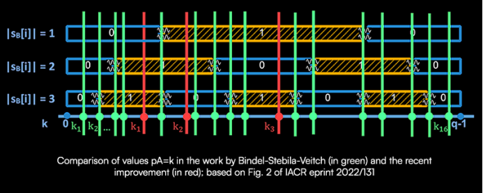 该论文可以大幅降低攻击所需的问询次数,具体来说:可以把p_A需要的值降低到29个。最新的这个改进的想法是更加巧妙地选择p_A的值。从下图可以看出,实际上红色表示的这三个值就足以唯一地确定私钥系数的绝对值。这一想法是确定与可能的私钥系数绝对值唯一对应的码字。例如,如果码字k_1-k_2-k_3 = 0-1-1,对应私钥系数的绝对值就是1。如果码字是1-1-0或者1-0-1,我们就可以知道绝对值分别是2或3。