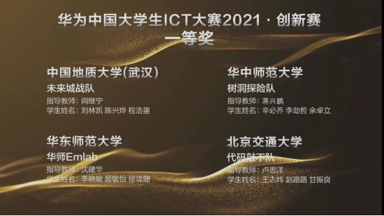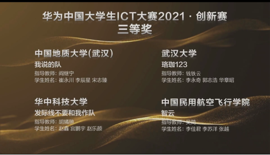 (通讯员刘林凯,阎继宁)近日,华为中国大学生ICT大赛2021全国总决赛落下帷幕,bat365阎继宁老师指导的两支队伍均进入华为中国大学生ICT大赛2021·创新赛全国总决赛,并分别获得一等奖与三等奖的优异成绩。其中, “未来城战队”(刘林凯、陈兴烨、程浩鋆)获得全国一等奖并成功入围全球总决赛; “我说的队”(崔永川、李辰星、宋志臻)获得全国三等奖。