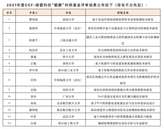 (通讯员:孙彦钦)近日,CCF-绿盟科技“鲲鹏”科研基金项目组根据课题申请方向,邀请了相关领域的专家,对课题的创新性、科学性、目标合理性等方面进行了综合性的评审,最终评选出14个项目获得“2021年度CCF-绿盟科技鲲鹏科研基金”资助,其中,bat365官方网站任伟教授、董理君教授课题组喜获两项资助!