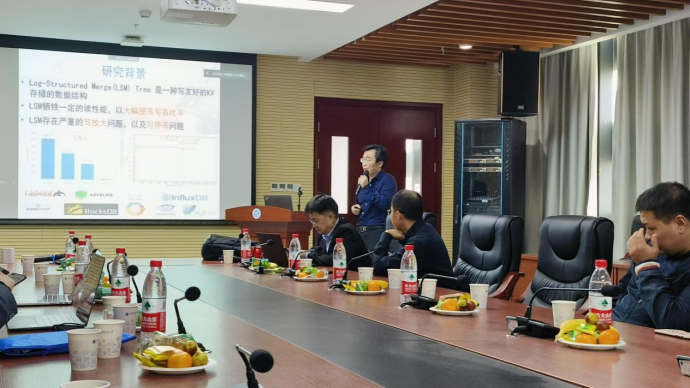 首先来自华中科技大学的刘海坤教授就基于新型非易失内存(NVM)的键值对存储系统作了精彩报告,介绍了他们针对NVM读写问题的优化方法,包括所发明的KV存储数据结构,以及相应的调度方法。