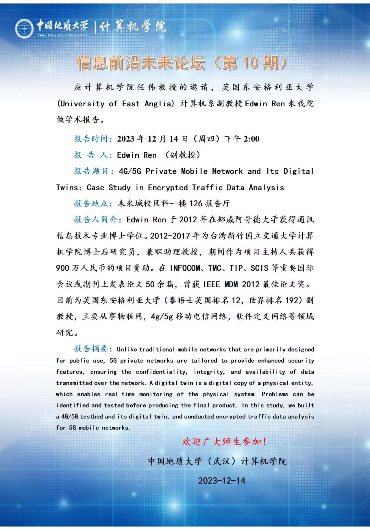 信息前沿未来论坛(第10期):英国东安格利亚大学Edwin Ren教授
